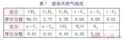 某城市的天然氣門站需將壓力為5.0MPa,溫度為25℃,流量為7.0×104m3/h(標態(tài)為15.56℃,101325Pa)的高壓天然氣降壓到0.2MPa,其調(diào)壓過程采用圖l所示的天然氣部分液化調(diào)峰型LNG生產(chǎn)工藝流程。進站天然氣組成見表1。