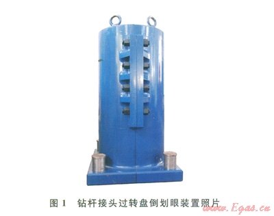 針對(duì)鉆桿接頭過(guò)轉(zhuǎn)盤(pán)面劃眼的操作難點(diǎn),研制了鉆桿接頭過(guò)轉(zhuǎn)盤(pán)倒劃眼裝置,滿足了鉆桿接頭及加厚部位過(guò)轉(zhuǎn)盤(pán)時(shí)的倒劃眼作業(yè)。