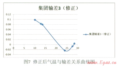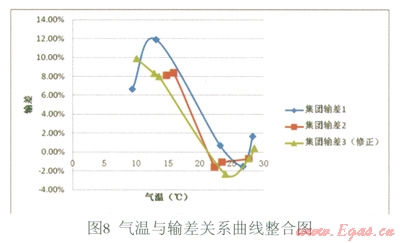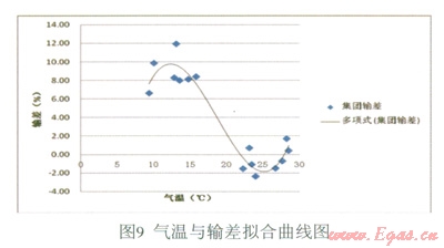 由表l的計(jì)算結(jié)果可知,擬合效果很好。因此,可得到回歸方程:y=0.011x3-0.621x2+10.260x-43.096(注:x為氣溫單位℃,y為百分?jǐn)?shù)表示的輸差),其曲線如圖9所示: