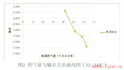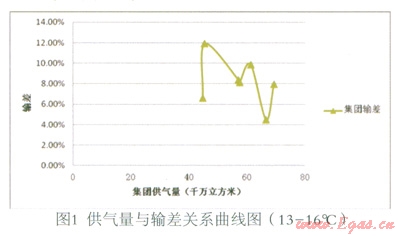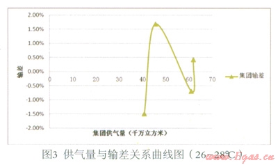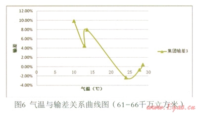 (3)在現(xiàn)有數(shù)據(jù)基礎(chǔ)上,暫未發(fā)現(xiàn)供氣量與輸差之間的明顯函數(shù)關(guān)系。但是,從圖8觀察發(fā)現(xiàn),輸差曲線1、2、3(修正)對(duì)應(yīng)的供氣量依次為:41—45、56—60、61—66,單位千萬立方米。隨著供氣量的大幅上升,輸差曲線呈向左下方平移的趨勢。即溫度等其他條件一定的情況下,隨著供氣量的大幅增加,輸差有減小的趨勢。初步分析,可能是由規(guī)模效應(yīng)導(dǎo)致。此推斷是否成立有待進(jìn)一步的研究,可做為下一研究課題。