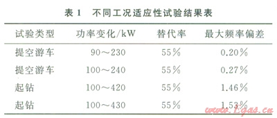 3)提空游車適用性試驗(yàn)結(jié)果分析。試驗(yàn)井深4000m,單機(jī)功率從l00kW突加至230kW,發(fā)電機(jī)組在雙燃料模式下頻率波動(dòng)0.2%,相對(duì)于柴油模式0.2%的頻率波動(dòng),無影響。起鉆試驗(yàn)單機(jī)功率從l00kW突加至430kW,發(fā)電機(jī)組在雙燃料模式下頻率波動(dòng)1.53%,相對(duì)于柴油模式1.2%的頻率波動(dòng)有所增加,但不影響鉆井工作,試驗(yàn)結(jié)果如表1所示。