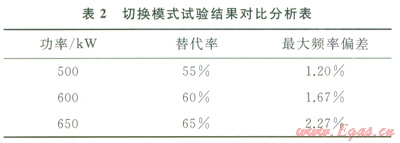 4)切換模式對(duì)比分析。分別在500kW、600kW和650kW 3種工況下,進(jìn)行天然氣切斷時(shí)的響應(yīng)測試,最大頻率偏差2.27%,小于國家標(biāo)準(zhǔn)5%。分別在500kW(替代率55%)、600kW(替代率60%)和650kW(替代率65%)工況下,GTI機(jī)組頻率增加均沒有超過l%。試驗(yàn)結(jié)果表2所示。