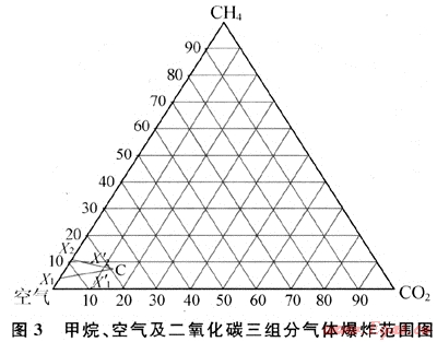 根據(jù)以上實(shí)驗(yàn)結(jié)果,繪制了CH4、CO2及空氣3組分氣體爆炸范圍圖,如圖3所示。經(jīng)檢測得知可燃?xì)釩H4在含有10%(體積分?jǐn)?shù)) CO2的混合空氣中的爆炸下限和上限分別為(X1、X2)、(X1’、X2’),三角形X1X2C即為CH4、CO2及空氣3組分氣體爆炸范圍。