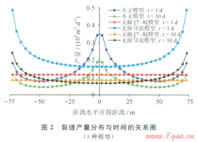 圖2是3種模型第l條裂縫的產(chǎn)量分布對比結(jié)果。采用無限導(dǎo)流模型計算結(jié)果表明,由于沒有考慮裂縫內(nèi)的壓力降落,在生產(chǎn)初期(t=ld)裂縫內(nèi)的產(chǎn)量分布為“U”形,裂縫兩端產(chǎn)量相對較高,這與本文參考文獻(xiàn)[15]規(guī)律一致;本文模型考慮了裂縫產(chǎn)量非均勻分布以及裂縫內(nèi)的壓力損失,裂縫產(chǎn)量在水平井筒附近出現(xiàn)局部峰值,且隨裂縫內(nèi)壓力損失增大,井筒附近裂縫產(chǎn)量的峰值越明顯,這是由于越靠近井簡裂縫生產(chǎn)壓差越大,裂縫產(chǎn)量越高造成的;由于裂縫段內(nèi)相互干擾,隨著生產(chǎn)時間的增加,裂縫產(chǎn)量分布趨于均勻,但由于水平井筒壓力最低,裂縫上產(chǎn)量分布為近似“雙U”型,這與本文參考文獻(xiàn)[l4]規(guī)律相符合。