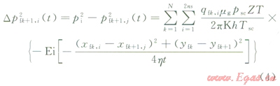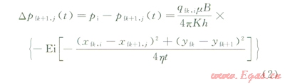 式(4)就是所有裂縫線匯單元同時生產(chǎn)時間t后在O點(diǎn)產(chǎn)生的壓力降落響應(yīng)方程。
