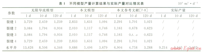 分別按照裂縫無限導(dǎo)流模型、本文模型以及本文參考文獻(xiàn)[7-8]的計算結(jié)果與實(shí)際產(chǎn)量對比(表1)??梢钥闯?,本文模型的計算結(jié)果從初期到穩(wěn)定生產(chǎn)階段最接近,表明本文模型準(zhǔn)確性高。從3種模型計算結(jié)果的對比來看:無限導(dǎo)流模型計算生產(chǎn)ld時的產(chǎn)量為13.626×104m3/d、生產(chǎn)120d后產(chǎn)量為4.346×104m3/a,遠(yuǎn)高于實(shí)際產(chǎn)量,表明不能忽略裂縫內(nèi)壓力損失的影響。從本文參考文獻(xiàn)[7-8]模型的計算結(jié)果與實(shí)際產(chǎn)量對比可以看出,生產(chǎn)初期差別較大(分別為6.904×104m3/a和9.214×104m3/d),而在生產(chǎn)120d的差別變小,這表明采用均勻產(chǎn)量分布的假設(shè)與實(shí)際情況存在較大偏差。