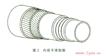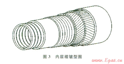柔性管道主要分為兩種類型:內(nèi)層平滑型(圖2)和內(nèi)層褶皺型(圖3)。主要區(qū)別是:前者與介質(zhì)接觸的最內(nèi)層材料為塑性管道,而后者最內(nèi)層材料為金屬互鎖層。內(nèi)層褶皺型柔性管可以應(yīng)用于油田和氣田,通球時不會對內(nèi)壁造成影響,而內(nèi)層平滑型應(yīng)用于油田,氣田應(yīng)用較少,在通球和管線內(nèi)出現(xiàn)真空工況時,需要避免外力對內(nèi)壁的破壞。除了最內(nèi)層的區(qū)別外,其他各層材料及功能都是相似的,