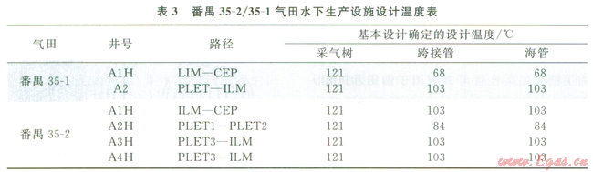 在基本設(shè)計過程中,對番禺35-2/35-1水下生產(chǎn)設(shè)施設(shè)計溫度確認(rèn)(表3)。在詳細(xì)設(shè)計中,溫度的調(diào)整會導(dǎo)致水下設(shè)備(包括各類球閥和閘閥、水下連接器、水下管匯和水下采氣樹)及水下管線(生產(chǎn)管線和跨接管)設(shè)計的調(diào)整,不但影響項目后期的進(jìn)度和費用,也會限制生產(chǎn)井的產(chǎn)能,從而不能按照預(yù)定配產(chǎn)進(jìn)行生產(chǎn)。