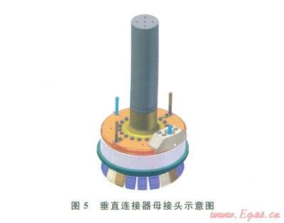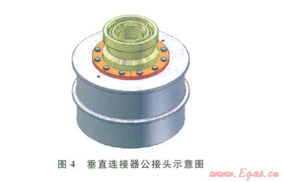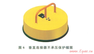垂直連接器的公接頭一般安裝在管匯/采油樹上,母接頭裝在跨接管上、安裝時與公接頭對接(圖4、5)。水下連接器保護(hù)帽分為不承壓和承壓兩種形式(圖6、7)。不承壓保護(hù)帽對水下連接器的公接頭起到保護(hù)作用,也可隨著接頭安裝到水下,一般建議在水下的停留時間不超過42d。承壓保護(hù)帽可用于長期的公接頭保護(hù)(期限與公接頭使用壽命相同),根據(jù)密封形式的不同,也可用做隔斷使用,即橡膠密封的承壓保護(hù)帽可用作二級隔斷使用,金屬密封的承壓保護(hù)帽可用作一級隔斷使用。