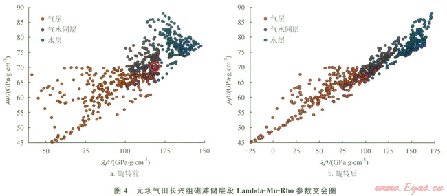 圖4為元壩地區(qū)長興組礁灘儲層段井上Lambda-Mu-Rho參數(shù)交會圖。從圖4中可以看到:雖然敏感彈性參數(shù)lr能將氣層、水層以及氣水同層基本區(qū)分開,但是識別精度還不夠。因此,為提高lr參數(shù)的識別精度,采用了坐標選擇的方法,其基本原理如下。
