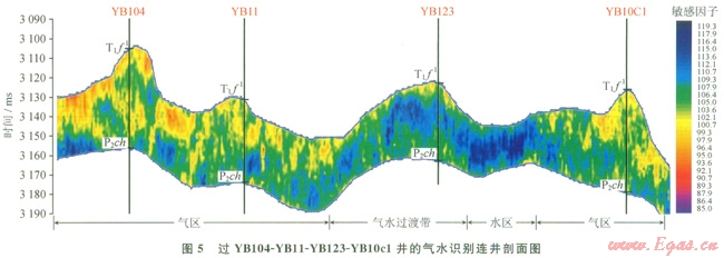 利用該技術(shù)完成了元壩氣田東部區(qū)域的氣水檢測,從識別的結(jié)果來看,與實鉆井的測試情況基本一致,也證實了該方法在該地區(qū)的有效性。圖5為該區(qū)過YBl04、YBll、YBl23、Ybl0cl井連井氣水識別剖面圖。其中YBl04測試獲得氣123×104m3/d,YBll測試獲得氣51×104m3/d,YBl23測試獲得氣5.3×104m3/d,水290m3/d,Ybl0cl測試獲得氣107×104m3/d,從圖5中可以看到,從產(chǎn)氣的YBl04井、YBll井到處于氣水過渡帶的YBl23井,穿過一段灘,間水區(qū)然后一直到產(chǎn)氣的YB10cl井,其氣區(qū)、水區(qū)分布帶及過渡帶清晰,與實鉆情況吻合好。