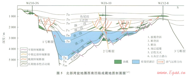 北部灣盆地處于南海北部大陸架西段,盆地經(jīng)歷古近紀(jì)斷陷、新近紀(jì)與第四紀(jì)坳陷、新構(gòu)造活動(dòng)階段,二級構(gòu)造單元呈三坳兩隆,即北部坳陷、企西隆起、中部坳陷、南部隆起和南部坳陷,三級構(gòu)造單元包括l0多個(gè)凹陷和凸起[2,14](圖4、5)。上述凹陷被次凸等進(jìn)一步分隔成多個(gè)洼陷,多數(shù)洼陷呈“肉(古近系)厚皮(新近系)薄”的地層特征,洼陷是油氣生成的基本單元。烴源巖為始新統(tǒng)流沙港組中深湖相泥巖,其有機(jī)質(zhì)類型以腐泥型和偏腐泥混合型為主,有機(jī)質(zhì)豐度高[3],屬于好烴源巖,比較單一,但在各洼陷分布差異甚大。北部灣盆地地溫梯度較高,為32.9±7.1℃/km,大地?zé)崃髦禐?span lang="EN-US">65.7±8.9mW/m2,屬于熱盆。流二段烴源巖R。介于0.2%~l.2%,熱演化程度為低熟成熟階段,以生油為主[2-3]。因此受源熱共控,北部灣盆地部分凹陷成為富油凹陷,已證實(shí)的富油凹陷有潿西南凹陷(由3個(gè)洼陷組成)、福山凹陷和烏石凹陷東洼。縱向上石油分布于石炭系古潛山組合、古新統(tǒng)長流組—始新統(tǒng)流沙港組下組合、漸新統(tǒng)潿洲組中組合、新近系下洋組—角尾組上組合。北部灣盆地自新近紀(jì)以來,絕大多數(shù)區(qū)域新構(gòu)造運(yùn)動(dòng)微弱[2,14],石油近距離或源內(nèi)聚集,目前北部灣盆地發(fā)現(xiàn)的石油主要集中在中、下組合。