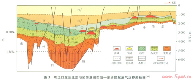 珠江口盆地北部坳陷帶(圖2、3)處于南海北部大陸邊緣陸架上,盆地基底是燕山期島弧帶,盆地形成經(jīng)歷古近紀(jì)斷陷、新近紀(jì)坳陷與新構(gòu)造期3個(gè)階段。其中始新統(tǒng)文昌組沉積末期盆地受到強(qiáng)烈改造,地層遭受較大規(guī)模剝蝕。盆地二級構(gòu)造單元有珠一坳陷和珠三坳陷等。三級構(gòu)造單元包括10多個(gè)凹陷和凸起。凹陷是潛在的生烴單元,但都比較破碎,多數(shù)凹陷被次級凸起進(jìn)一步分隔成多個(gè)洼陷。洼陷才是最基本的生烴單元,多數(shù)洼陷呈“肉(古近系)厚皮(新近系)薄”特征。烴源巖為始新統(tǒng)文昌組中深湖相泥巖、漸新統(tǒng)恩平組湖沼相煤系地層[3],部分凹陷可能殘留有中生代海相—海陸過渡相烴源巖。該區(qū)域地溫梯度及大地?zé)崃髦捣謩e為36.6±6.0℃/km和66.1±8mW/m2[15],屬于熱盆。始新統(tǒng)文昌組中深湖相泥巖烴源巖有機(jī)碳含量介于0.50%~4.88%,平均為1.22%,以偏腐泥混合型干酪根為主,埋藏深度處在生油窗范圍,主要生油,是主力生油巖;恩平組因埋藏淺、熱演化程度低在珠一坳陷生成少量石油,在珠三坳陷生成部分天然氣。因此主力烴源巖為始新統(tǒng)文昌組,比較單一,決定了以油為主的縱向分布特征[3]。已發(fā)現(xiàn)的生油洼陷有惠州26洼、陸豐l3洼、番禺4洼、恩平l7洼、珠三坳陷文昌B洼等??v向上石油分布在基底組合、始新統(tǒng)文昌組—恩平組下組合、漸新統(tǒng)珠海組—下中新統(tǒng)珠江組中組合、中上新統(tǒng)粵海組—萬山組上組合。珠江口盆地北部新構(gòu)造活動(dòng)劇烈,石油晚期運(yùn)移活躍,目前發(fā)現(xiàn)的石油主要集中在中組合,其他組合是下一步的油氣勘探方向。