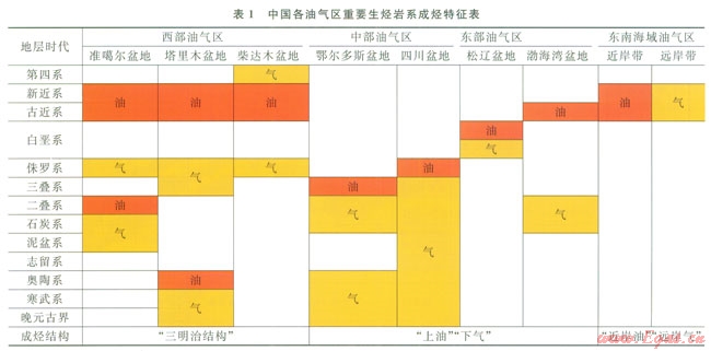 中國不同盆地群的盆地在縱向上有不同的油氣(包括常規(guī)油氣和非常規(guī)油氣)成烴樣式(表1)。如鄂爾多斯盆地油氣田呈“下氣(古生界)上油(三疊系—侏羅系)”格局、松遼盆地油氣田呈“下氣(下白堊統(tǒng))上油(上白堊統(tǒng))”格局,其他盆地也呈現(xiàn)出油氣田在空間上有序分布的特征(表1)。但以油氣區(qū)(盆地群)為單元,進(jìn)而討論中國海陸總體油氣田分布規(guī)律的研究并不多見,而進(jìn)一步歸納全國油氣田空間分布模式、揭示其成因,準(zhǔn)確把握油氣田分布規(guī)律,對于指導(dǎo)油氣領(lǐng)域勘探有著極其重要的意義。