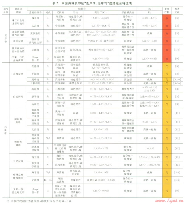中國東南沿海油氣區(qū)指東海海域和南海海域油氣區(qū)。油氣區(qū)內(nèi)盆地的基底是印支、燕山期造山帶,盆地屬于邊緣海盆地,結(jié)構(gòu)呈斷陷—坳陷,充填的主要地層為新生界(局部有中生代殘留盆地)。盆地的烴源巖時(shí)代相對單一,主要發(fā)育一套古近紀(jì)—新近紀(jì)地層[2-13],在不同盆地生油氣性質(zhì)不同,從油氣田分布看,可以分成近岸原油帶和遠(yuǎn)岸天然氣帶(圖1、表2)。