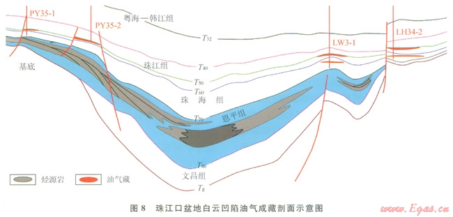 珠江口盆地位于南海北部大陸邊緣東段,白云凹陷位于珠江口盆地南部坳陷帶珠二坳陷內(nèi),凹陷基底是燕山期島弧帶,凹陷內(nèi)新生代地層發(fā)育。白云凹陷演化歷經(jīng)了古近紀(jì)裂陷期,早、中中新世坳陷期和晚中新世以來的新構(gòu)造期[20]。白云凹陷發(fā)育始新統(tǒng)文昌組中深湖相泥巖、下漸新統(tǒng)恩平組海陸過渡相煤系地層與海灣相泥巖、上漸新統(tǒng)珠海組海相泥巖共計(jì)3套烴源巖(圖8)。恩平組海陸過渡相煤系地層海灣相泥巖是主力烴源巖,其中暗色泥巖總有機(jī)碳含量介于1.0%~l.5%,展布規(guī)模大,烴源巖母質(zhì)類型多為偏腐殖混合型及腐殖型。恩平組煤系烴源巖主要發(fā)育在凹陷北部斜坡區(qū)域,展布范圍超過5000km2,煤層發(fā)育,在PY33-1-1井恩平組有煤20層,累計(jì)厚度為22.98m[18]。文昌組中深湖相烴源巖有機(jī)碳含量介于0.50%~4.88%,平均為1.22%,以偏腐泥混合型十酪根為主。白云凹陷位于洋陸過渡區(qū),地溫梯度及大地?zé)崃髦捣謩e高達(dá)4.5℃/100m和77.5mW/m2[15],屬于超熱盆。白云凹陷恩平組底部烴源巖現(xiàn)今成熟度在凹陷中心部位R。為0.5%~2.0%,主凹最深處尺。達(dá)到2.0%,在凹陷邊緣部位R。介于0.5%~0.7%;有機(jī)質(zhì)熱演化多處在成熟~高熟凝析油及生氣階段,其烴類產(chǎn)物以大量天然氣及少量輕質(zhì)油及凝析油為主;主洼以生氣為主,周邊的衛(wèi)星洼陷埋藏淺,以生油為主。此外,文昌組烴源巖在白云凹陷斜坡帶現(xiàn)今R。為2.1%,表明文昌組烴源巖也已經(jīng)達(dá)到生氣階段。白云凹陷及其鄰區(qū)發(fā)育漸新統(tǒng)儲(chǔ)蓋組合和新近系儲(chǔ)蓋組合,油氣勘探都有重要發(fā)現(xiàn);目前的油氣勘探發(fā)現(xiàn)多在珠江組;預(yù)測主力儲(chǔ)蓋組合為恩平組與珠海組。