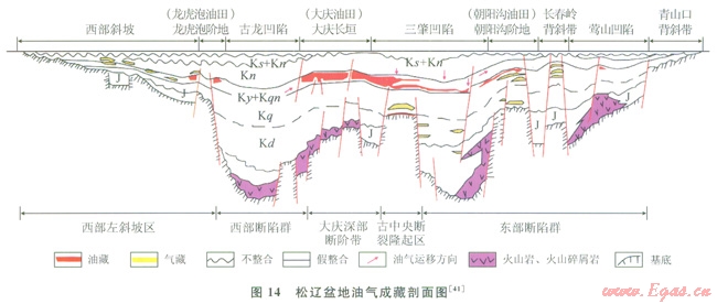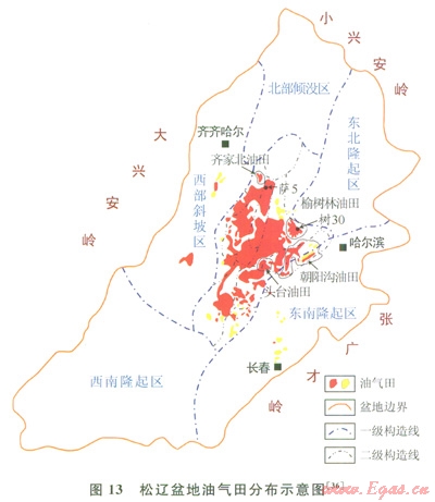 松遼盆地油氣勘探始于l955年,l959年在坳陷區(qū)鉆探取得重大突破——發(fā)現(xiàn)了大慶油田,2000年以后于深層斷陷發(fā)現(xiàn)徐深氣田。迄今為止,該盆地內(nèi)已發(fā)現(xiàn)了眾多油氣田,呈現(xiàn)上油田、下氣田格局,上部為巨型的大慶油田等油田,下部為徐深氣田等大氣出。