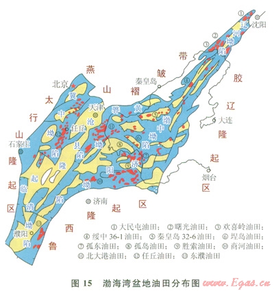 渤海灣盆地油氣勘探大規(guī)模始于20世紀(jì)50年代;60-80年代是陸地區(qū)油田發(fā)現(xiàn)的高潮期,先后發(fā)現(xiàn)了勝利油田、大港油田、華北油田、遼河油田、中原油田;20世紀(jì)80年代以來,渤海海域接連發(fā)現(xiàn)一批大油田。渤海灣盆地目前已發(fā)現(xiàn)數(shù)百個(gè)油田及一批中小氣田;原油儲(chǔ)量累計(jì)上百億噸,天然氣儲(chǔ)量累計(jì)約2000×108m3,主要是溶解氣;石油主要形成于新生界,氣層氣主要形成于古生界;呈現(xiàn)出原油非常富、天然氣相對少的格局。