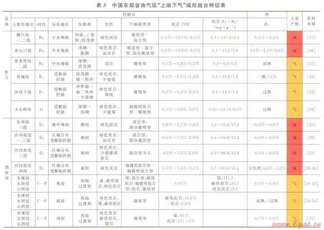 我國陸地區(qū)東部油氣區(qū)包括東北吉黑中新生代裂谷區(qū)(主要包括松遼盆地、海拉爾盆地、二連盆地、大楊樹盆地、三江盆地等,主要形成于晚侏羅世—白堊紀(jì);僅依蘭—伊通地塹系形成于古近紀(jì))、渤海灣盆地(主要包括下遼河坳陷、遼東灣坳陷、渤中坳陷、濟(jì)陽坳陷、黃驊坳陷、冀中坳陷、臨清坳陷、埕寧隆起、滄縣隆起、內(nèi)黃隆起等,主體形成于古近紀(jì))、南華北盆地、南襄盆地、江漢盆地、北黃海盆地和蘇北—南黃海盆地等(圖1)。這些盆地基底為克拉通基底或海西—印支褶皺區(qū)。盆地成盆期及其期次不同、各期盆地原型也不同,經(jīng)歷的改造作用差異巨大,多為殘疊甕地,即多期原型盆地的殘余疊合在一起,烴源巖發(fā)育程度不同(表3)。受區(qū)域熱流場和埋藏作用的綜合控制,烴源巖經(jīng)受不同的熱作用,導(dǎo)致下部層系烴源巖以生氣為主,上部層系烴源巖以生油為主,形成“下氣上油”兩類成烴模式。如松遼盆地白堊系下部生成天然氣、白堊系上部生成巨量石油,呈現(xiàn)出下生氣、上生油的格局;渤海灣盆地前新生代殘余盆地生成天然氣、古近系盆地生成巨量石油,也呈現(xiàn)出“下氣上油”的特點(diǎn)。