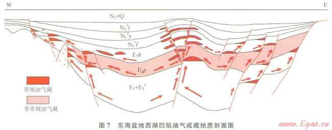 東海盆地位于東海陸架區(qū),基底是燕山期陸緣花崗巖帶,新生代歷經(jīng)裂陷期、坳陷期及新構(gòu)造期3大構(gòu)造階段。其中裂陷期為古新世—始新世,坳陷期為漸新世—中新世,上新世—第四紀(jì)為新構(gòu)造期。東海盆地以新生代沉積地層為主,從古新統(tǒng)至第四系均有發(fā)育。該盆地經(jīng)歷了5次主要構(gòu)造改造作用,特別顯著的是發(fā)生過多期正反轉(zhuǎn)(圖6、7)。東海貧地呈二坳二隆構(gòu)造格局。西部坳陷帶(長江坳陷、臺(tái)北坳陷)、中央隆起帶(虎皮礁隆起、海礁隆起、漁山東隆起)、東部坳陷帶(福江凹陷、西湖凹陷、釣北凹陷)和東部隆起帶(釣魚島隆褶帶,即陸架外緣隆起)。東海盆地形成于太平洋板塊俯沖導(dǎo)致的弧后擴(kuò)張作用;隨著俯沖帶的不斷東撤,盆地內(nèi)部呈由西向東逐漸變新的構(gòu)造遷移特征,沉積—沉降中心逐漸東移,形成了凹陷之間構(gòu)造—沉積演化的差異。古新世裂陷主要發(fā)生在東海盆地的西部坳陷帶,始新世—漸新世裂陷主要發(fā)生在其東部坳陷帶。