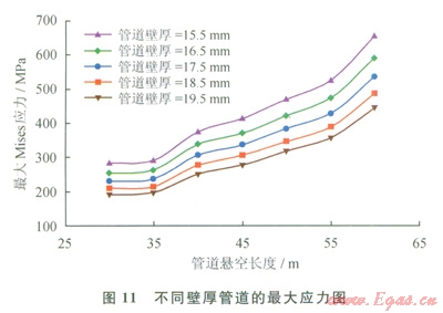 3)以上工況,把管道壁厚分別改變?yōu)?span lang="EN-US">15.5mm、16.5mm、18.5mm、19.5mm,計(jì)算管道最大Mises應(yīng)力的變化情況(圖11),最大Mises應(yīng)力隨壁厚的增加而下降,安全裕度隨壁厚增加而升高。為此,管道壁厚的增加量不能太大,若壁厚過大,為保持管道質(zhì)量不變,必須減少管徑,這會(huì)影響管道輸量;若要保持管道內(nèi)徑不變,壁厚增加太多,勢必使單位管段的耗材和質(zhì)量劇增,以至管道豎向受力增大。本文僅對(duì)管道壁厚作適度調(diào)整以觀察受力與管材結(jié)構(gòu)變化的關(guān)聯(lián)性,為碳纖維強(qiáng)固提供理論依據(jù)。碳纖維質(zhì)量小于鋼管,自身抗拉能力強(qiáng),對(duì)擘厚影響較小,這些特點(diǎn)可滿足上述分析的需要:即重量變動(dòng)不大、適當(dāng)改變材料組成及結(jié)構(gòu)、提高抗彎能力。
