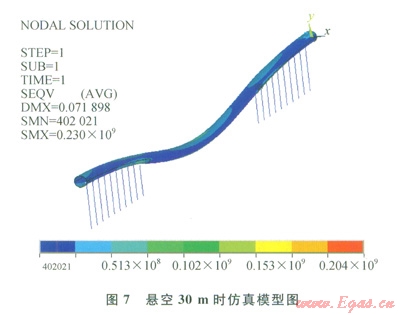 懸空30m時(shí),仿真結(jié)果如圖7,在沿管軸方向(圖中x方向)的對(duì)稱中心處管道變形位移最大,在兩固支端、埋地與懸空的過渡處、對(duì)稱中心處應(yīng)力集中較明顯,沿豎直方向(圖7中y方向)管道上部應(yīng)力集中比管道下部明顯,最大應(yīng)力為230MPa,小于屈服極限485MPa,所以管道處于安全范圍內(nèi)。