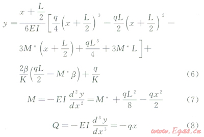 等效彈塑性地基模型綜合了多種影響因素,體現(xiàn)了管道的幾何非線性和土壤的物理非線性。在針對(duì)管道沉陷、沖溝和塌陷等多種力學(xué)模型中,彈塑性地基模型是相對(duì)接近實(shí)際的。但是,彈塑性地基模型因其綜合因素多而致使其解析表達(dá)式復(fù)雜,尋求解析解難度較大。因此,工程上在對(duì)懸空管道力學(xué)行為進(jìn)行分析時(shí)主要采用Winkler地基模型或《現(xiàn)役管道的不停輸移動(dòng)推薦做法》,而較少使用彈塑性地基模型。本文主要目的是為了得到管材結(jié)構(gòu)與受力之間的關(guān)聯(lián)性,要求計(jì)算結(jié)果在可信區(qū)間內(nèi)能解釋工程問題,選用Winkler地基模型可較大程度的簡化計(jì)算。