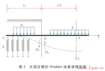圖2為模型簡圖,與彈塑性地基模型相比,埋地段影響區(qū)為彈性變形區(qū)(無塑性變形)。管道變形前軸線為x軸,y軸過對(duì)稱中心,管道各截面的y坐標(biāo)值為對(duì)應(yīng)部分的管道撓度,任意截面的轉(zhuǎn)矩為M,M0和Q0是管道懸空段與埋地段交界處的彎矩和剪力。利用Winkler假定,通過懸管長度(L)、埋地管長(L1)、懸空段載荷(q)(管自重和介質(zhì)重)、埋地段載荷q0(圖3中上覆土重q土=H·L·D·r土·g、管自重、介質(zhì)重)、已知地基系數(shù)(K0),在對(duì)管道兩端固支的情況下求管道各微段的撓度(y)、轉(zhuǎn)矩(M)、豎直剪力(Q)值[8-10]。