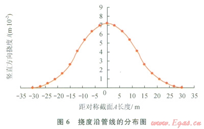 1)圖5、6表示了現(xiàn)場實(shí)際懸空長度為30m時(shí),應(yīng)力和撓度沿管線的分布情況,可見Mises應(yīng)力和豎直方向應(yīng)力在±15m處最大,而最大撓度出現(xiàn)在模型C-C處,也就是懸空水平對(duì)稱處。