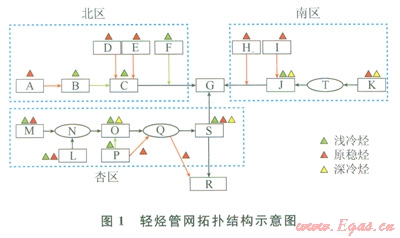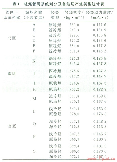 某油氣田輕烴管網(wǎng)系統(tǒng)為枝狀的網(wǎng)絡(luò)結(jié)構(gòu),總長度為410.9km,包含12條輸烴管道、l6個油氣處理站、輸烴管道38條(管徑為76~219mm)。經(jīng)過多年的擴(kuò)建改造,該輕烴管網(wǎng)系統(tǒng)的管道、產(chǎn)烴站場逐漸增多,廢棄、在用、在建管道交錯。為便于研究,根據(jù)管道之間的地域因素和水力相關(guān)性,將其劃分為3個互相獨立的子系統(tǒng),分別進(jìn)行研究。