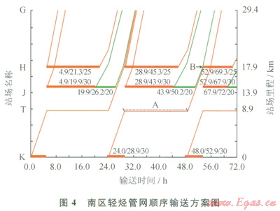 綜合考慮各站場產(chǎn)烴類型、產(chǎn)烴量、泵機(jī)組外輸量、啟泵時間需求、管道承壓能力、輸烴順序、混烴界面等[11],計算得出適用于南區(qū)輕烴管網(wǎng)的順序輸送方案(圖4)[12]。圖4的橫軸表示輸送時間,縱軸表示各站場距離首站的距離,圖中的有色矩形表示輕烴注入的時間窗(矩形長方向的起點為開始注入時間,終點為結(jié)束注入時間),時間窗的顏色表示注入輕烴的類型,綠色代表淺冷烴,紅色代表原穩(wěn)烴。另外,時間窗的高度和流量大小成正比。時間窗周圍顯示該批次的注入工況,如“4.9/21.3/25”表示該時間窗注入開始于4.9h,結(jié)束于21.3h,流量為25m2/h。T節(jié)點輕烴的存儲時間依據(jù)各站場注烴時間而定,如,K站場注入的原穩(wěn)烴在T節(jié)點暫儲(見圖4中A虛線處),以使K站原穩(wěn)烴、J站淺冷烴、H站原穩(wěn)烴產(chǎn)生的混烴量最少(見圖4中B點)。