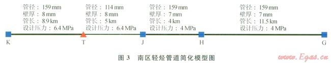以南區(qū)為例說明該輕烴管網(wǎng)系統(tǒng)順序輸送調(diào)度計劃的制訂過程。依據(jù)南壓輕烴注入的實際情況(圖1),考慮將K、J站場所產(chǎn)深冷烴通過單獨管道進(jìn)行外輸,而K、I、H站場所產(chǎn)原穩(wěn)烴和J站場所產(chǎn)淺冷烴進(jìn)行順序輸送。南區(qū)節(jié)點T并不產(chǎn)烴,僅利用其較大的儲罐容量作調(diào)節(jié)之用。根據(jù)現(xiàn)場提供的南區(qū)輕烴管道里程、高程、管徑、壁厚、管長等基礎(chǔ)參數(shù)(圖2),為便于研究,將南區(qū)管道模型簡化為單源多注入的管道系統(tǒng)(圖3)。