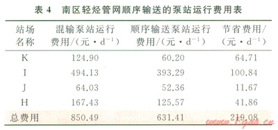 結(jié)合現(xiàn)場數(shù)據(jù),從泵站運行費用和混烴量兩方面來驗證南區(qū)輕烴管網(wǎng)順序輸送方案的經(jīng)濟(jì)性(表4)[13]。表4表明,南區(qū)輕烴管網(wǎng)實現(xiàn)順序輸送后,可節(jié)省泵站運行費用76678元/a。