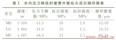 川中地區(qū)高壓天然氣井因Æl77.8mm尾管固井后,采用較低密度鉆井液替換井內(nèi)鉆井液鉆開目的層而使作用在井內(nèi)套管的內(nèi)壓力大幅度降低。該區(qū)塊Æ177.8mm尾管固井時鉆井液密度約為2.20g/cm3,而下一次開鉆鉆進(jìn)時,鉆井液密度降至1.35g/cm3左右。M8、G2、M9井Æl77.8mm尾管固井,氣層封固質(zhì)量優(yōu)良,候凝過程未發(fā)生氣竄,但井內(nèi)壓力大幅度下降后,喇叭口竄氣。該區(qū)塊水泥石楊氏模量10GPa,泊松比0.19,其余計算條件及結(jié)果如表2所示。以套管壁處水泥環(huán)徑向拉應(yīng)力達(dá)到抗拉強(qiáng)度為形成微環(huán)隙的臨界條件[7-8],由公式(3),計算出井內(nèi)壓力下降幅度超過40MPa后,3口井形成寬度l3.09~20.24mm的微環(huán)隙,密封能力顯著降低。