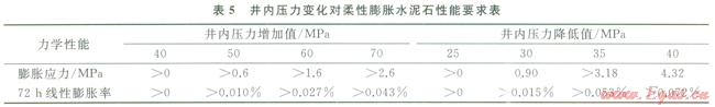 井下作業(yè)公司柔性自應(yīng)力水泥石能在高圍壓條件下膨脹,產(chǎn)生0.5~3.0MPa膨脹壓應(yīng)力,楊氏模量在5~7GPa,泊松比約為0.19,抗拉強(qiáng)度在2.5~3.5MPa。當(dāng)固井后井內(nèi)壓力增加時,通過釋放壓縮應(yīng)力,減小水泥環(huán)周向拉應(yīng)力,避免拉伸破壞,同時外觀體積微膨脹,可阻止微環(huán)隙形成。由公式(1)、(2)計算出表5所示不同井內(nèi)壓力變化情況下柔性膨脹水泥石體積膨脹要求。該水泥漿體系在相國寺儲氣庫井技術(shù)套管、頁巖氣井的油層套管固井中得到了成功應(yīng)用,固井質(zhì)量優(yōu)質(zhì),在經(jīng)過試壓、大型體積壓裂作業(yè)后,環(huán)空封固質(zhì)量好,未發(fā)生氣竄。