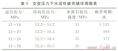 地下儲氣庫井天然氣注入和采出的作業(yè)使作用在井內(nèi)套管的內(nèi)壓力交替變化。這種交變壓力可能引起水泥石內(nèi)部固有的微裂紋緩慢擴(kuò)展、連通,導(dǎo)致水泥石疲勞破壞[9-11]。以井深2107m的儲氣庫井為例,水平地應(yīng)力30MPa,井徑215.9mm,套管直徑l77.8mm,壁厚11.51mm,運(yùn)行壓力12~28MPa,水泥石楊氏模量l0GPa,泊松比0.19,根據(jù)水泥石疲勞破壞方程[12]計算出交變壓力作用下普通水泥石疲勞破壞周期如表3所示。儲氣庫井注采氣過程中運(yùn)行壓力越高,普通水泥環(huán)越易疲勞破壞。當(dāng)達(dá)到最大運(yùn)行壓力時,只需數(shù)十次注采周期,水泥環(huán)即發(fā)生疲勞破壞。