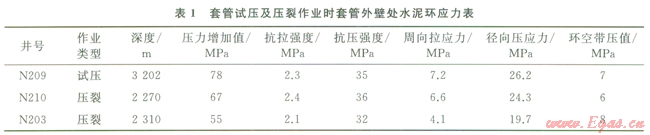 該作業(yè)使作用在井內(nèi)套管的內(nèi)壓力大幅度升高。四川盆地頁巖氣井Æl39.7mm油層套管固井后(套管壁厚9.17mm,井眼尺寸215.9mm)對套管柱試壓及壓裂作業(yè),井口壓力高達(dá)60MPa。N203井等井固井質(zhì)量優(yōu)質(zhì)率100%,但試壓或光套管壓裂作業(yè)后均出現(xiàn)環(huán)空帶壓。該區(qū)塊水泥石楊氏模量l0GPa,泊松比0.19,其余計算條件及結(jié)果如表l所示,由公式(1)和(2),試壓或壓裂作業(yè)后,套管壁處水泥環(huán)周向應(yīng)力均超過抗拉強(qiáng)度,發(fā)生拉伸破壞,導(dǎo)致水泥環(huán)密封失效。