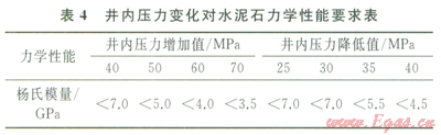 彈性水泥石具備了低楊氏模量、彈性變形能力強(qiáng)的特點(diǎn),能與套管、井壁協(xié)調(diào)變形,有效卸載,大幅度降低微裂隙及微環(huán)隙形成的可能性。由公式(1)、(2)計算出當(dāng)井內(nèi)壓力變化時,為避免水泥環(huán)破壞,需將水泥石楊氏模量降至適當(dāng)范圍(表4)。以斯倫貝謝為代表的典型彈性水泥石,楊氏模量在3.5~5.5GPa,泊松比約為0.22,抗拉強(qiáng)度在2.2~2.5MPa,在儲氣庫得到成功應(yīng)用,固井質(zhì)量優(yōu)質(zhì),在經(jīng)過試壓及下一次開鉆鉆進(jìn)井內(nèi)壓力變化后,固井質(zhì)量依然良好,未出現(xiàn)氣竄。