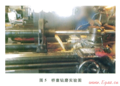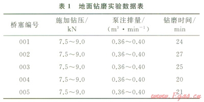將坐封有新型速鉆復(fù)合橋塞的試驗(yàn)套管固定于專(zhuān)用鉆磨試驗(yàn)架上,如圖5所示,用Æ73mm螺桿馬達(dá)帶專(zhuān)用磨鞋,水泥車(chē)泵注清水驅(qū)動(dòng)螺桿馬達(dá),進(jìn)行了5套橋塞鉆磨實(shí)驗(yàn),其實(shí)驗(yàn)數(shù)據(jù)如表1所示。