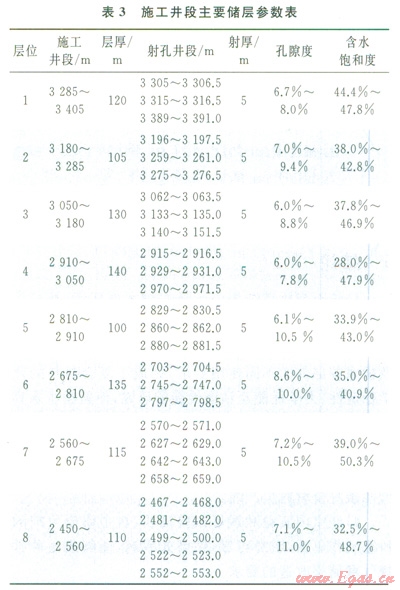 實(shí)例井是l口水平開(kāi)發(fā)井,完鉆井深3425m,入靶點(diǎn)井深2535m,人工井底深度3405m,水平段總長(zhǎng)890m,地層壓力為38.4MPa,地層溫度為88℃,儲(chǔ)層巖性為灰白色細(xì)砂巖。各施工井段主要儲(chǔ)層參數(shù)如表3所示。采用新型速鉆復(fù)合橋塞分8段壓裂,施工注入方式為Æ114.3mm光套管注入。