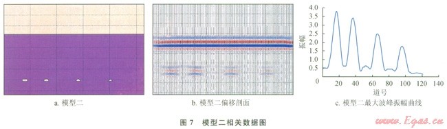 圖2-b是橢圓形溶洞偏移剖面,圖2-c為橢圓形溶洞最大波峰振幅曲線圖;圖3-b、圖3-c分別是菱形溶洞偏移剖面及最大波峰振幅曲線圖??梢钥吹?,無論是橢圓形模型還是菱形模型,隨著溶洞橫向尺度的增加最大波峰振幅是增加的,這和長方形溶洞正演模擬結(jié)果很相似。