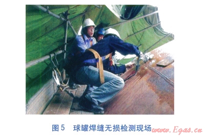由特種設備檢測機構(gòu)對球罐進行全面檢測。檢測項目包括宏觀檢測、壁厚測定、焊縫無損檢測、安全附件檢測等。焊縫無損檢測包括超聲波檢測、射線檢測、磁粉檢測、滲透檢測等。球罐焊縫無損檢測現(xiàn)場見圖5。
