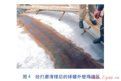 特種設備檢測機構(gòu)要對球罐內(nèi)外壁焊縫進行無損檢測。在進行無損檢測前,需要對焊縫區(qū)打磨清理(噴砂除銹),露出焊縫區(qū)金屬本色。經(jīng)打磨清理后的球罐外壁焊縫區(qū)見圖4.