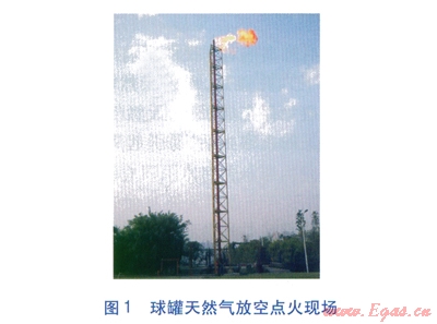 先將球罐內(nèi)天然氣壓力降至與城市燃氣管網(wǎng)壓力一致,通過儲配站中的點火塔將球罐內(nèi)余氣燃燒掉,直至球罐內(nèi)天然氣壓力與大氣平衡,再打開球罐上下入孔蓋。球罐天然氣放空點火現(xiàn)場見圖1。