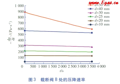 根據(jù)上述條件計(jì)算,在不同泄漏點(diǎn)孔徑d下,截?cái)嚅yB處的壓降逮率情況,計(jì)算結(jié)果見圖3,圖中計(jì)算起始時(shí)間為3s。