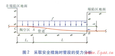 當塌陷區(qū)接近或達到允許沉降量時,點A處的管道將出現(xiàn)失穩(wěn),必須采取安全措施降低當量應力。安全措施的具體方法為:將管段AB上方的覆土挖走,將土壤荷載卸載。再從點A向塌陷斷裂帶非塌陷區(qū)一側(cè)開挖一段距離到達點C,并將管段翻下部掏空,以緩解管段AB的彎曲變形,以便較好地應對下一次沉降,將管段下部懸空部分填實后回填至沉降后地面高度。在實際操作中我們關心的是如何確定塌陷斷裂帶非塌陷區(qū)一側(cè)開挖長度。采取安全措施時管段的受力分析見圖2。