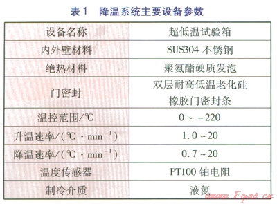 進(jìn)行低溫試驗時,爆炸初始溫度低至-170℃,為滿足溫度要求,降溫系統(tǒng)采用超低溫試驗箱,液氮冷卻,溫度由智能儀表自動控制。降溫系統(tǒng)主要設(shè)備參數(shù)見表1。