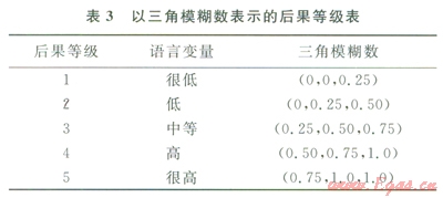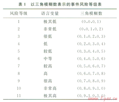 將引起燃?xì)夤艿佬孤┦录L(fēng)險(xiǎn)分為11個(gè)等級(jí)[8],相應(yīng)的語(yǔ)言變量及模糊數(shù)參照表l,語(yǔ)言變量可直觀表達(dá)風(fēng)險(xiǎn)因素的相對(duì)重要性。