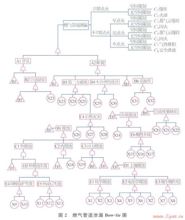 城市燃?xì)夤艿赖娘L(fēng)險(xiǎn)取決于管道失效的可能性和事故后果的嚴(yán)重性[3],為將燃?xì)夤艿朗鹿实那耙蚝蠊Y(jié)合起來(lái)進(jìn)行風(fēng)險(xiǎn)評(píng)價(jià),首次引入Bow-tie模型,將風(fēng)險(xiǎn)分析中的故障樹和事件樹聯(lián)系起來(lái)。Bow-tie模型最早出現(xiàn)在澳大利亞昆士蘭大學(xué)關(guān)于帝國(guó)化學(xué),工業(yè)公司危害分析的課程講義[4],隨后殼牌公司將其應(yīng)用于阿爾法鉆井平臺(tái)爆炸災(zāi)難分析中[5],至今這一技術(shù)已被廣泛應(yīng)用到一些重大事故。