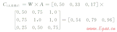 在計(jì)算結(jié)果事件后果影響時(shí)將后果因素的權(quán)重與其相應(yīng)的評(píng)價(jià)模糊數(shù)按矩陣乘法進(jìn)行合并[13]。如C1事件造成的第二級(jí)因素人員傷亡的后果計(jì)算如下。